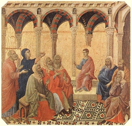Quando ebbero tutto compiuto secondo la legge del Signore, fecero ritorno in Galilea, alla loro città di Nazaret. Il bambino cresceva e si fortificava, pieno di sapienza, e la grazia di Dio era sopra di lui. I suoi genitori si recavano tutti gli anni a Gerusalemme per la festa di Pasqua. Quando egli ebbe dodici anni, vi salirono di nuovo secondo l'usanza; ma trascorsi i giorni della festa, mentre riprendevano la via del ritorno, il fanciullo Gesù rimase a Gerusalemme, senza che i genitori se ne accorgessero. Credendolo nella carovana, fecero una giornata di viaggio, e poi si misero a cercarlo tra i parenti e i conoscenti; non avendolo trovato, tornarono in cerca di lui a Gerusalemme. Dopo tre giorni lo trovarono nel tempio, seduto in mezzo ai dottori, mentre li ascoltava e li interrogava. E tutti quelli che l'udivano erano pieni di stupore per la sua intelligenza e le sue risposte. Al vederlo restarono stupiti e sua madre gli disse: «Figlio, perché ci hai fatto così? Ecco, tuo padre e io, angosciati, ti cercavamo». Ed egli rispose: «Perché mi cercavate? Non sapevate che io devo occuparmi delle cose del Padre mio?». Ma essi non compresero le sue parole.
